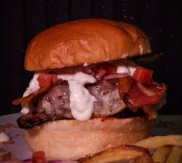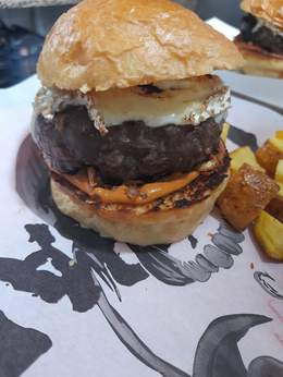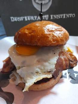 Carne de vaca madurada, pan brioche,queso cheddar fundido, doble de bacon, huevo frito, mayonesa de bacon ahumado y patatas fritas