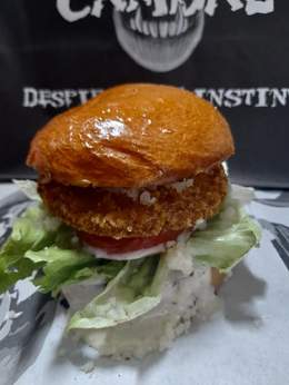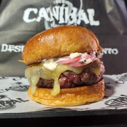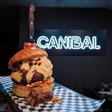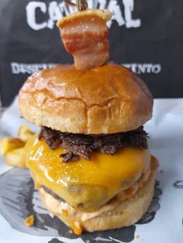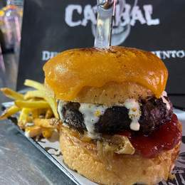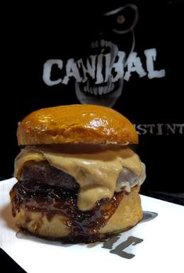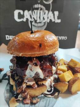 Carne de vaca madurada, pan brioche, doble de cheddar fundido, pulled beef, coronada con un torrezno de Soria, nuestra deliciosa salsa caníbal, doritos y patatas fritas
