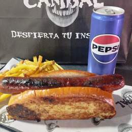 Pan brioche, salchicha de ternera, patatas y una lata de Pepsi original o zero azúcar.