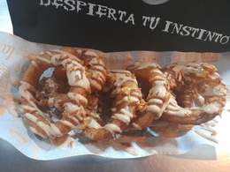 Patatas fritas caseras corte largo, mix de salsas bufalo (picante suave), salsa gorgonzola,pulled beef, y queso.