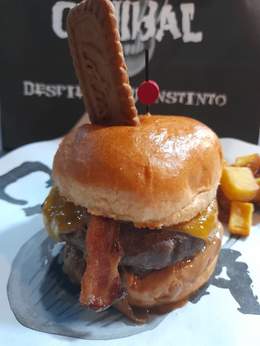 Carne de vaca madurada, pan brioche,queso cheddar, cebolla caramelizada, bacon, salsa casera de galleta lotus y patatas fritas.