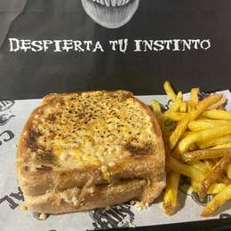 Sandwich de pulled beef con mayonesa de gravy, cebolla crunchy, queso de cabra, cebolla caramelizada, pepinillos caseros,salsa búffala y patatas.