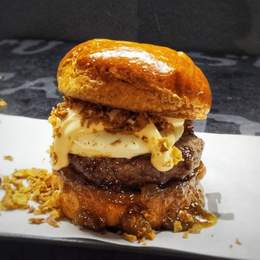 Carne de vaca madurada, pan brioche, queso Jack Monterrey, doble bacon, pepinillos, cebolla caramelizada, salsa spicy ( picante suave) y patatas fritas.