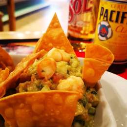 Langostinos salteados al tequila con guacamole y totopos de tortilla de maíz