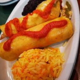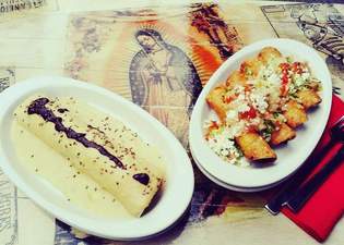 Tortilla de maíz rellenas de ternera, bañadas con salsa ranchera, pico de gallo y queso rallado.