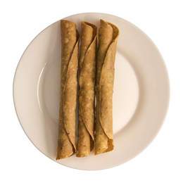 rollitos de tortilla de maíz frito, rellenos de pollo deshebrado, acompañados con lechuga,