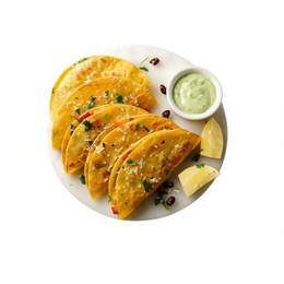 Envueltos en tortilla de maíz crujiente, rellenos de puré de patata, cilantro y queso, acompañado de lechuga, pico de gallo y salsa de tomate