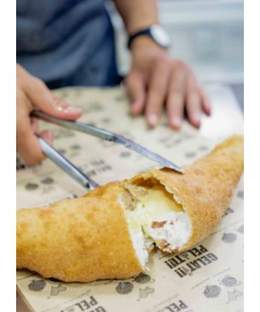 La masa se fríe hasta que queda dorada y crujiente, luego se adereza con una variedad de ingredientes frescos y de alta calidad. Riccotta, mozzarella bio y jamón York
