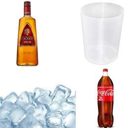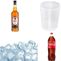 1 Botella de alcohol + 1 Botella de mezcla + 4 vasos grandes de plástico duro + 1 bolsa de hielos