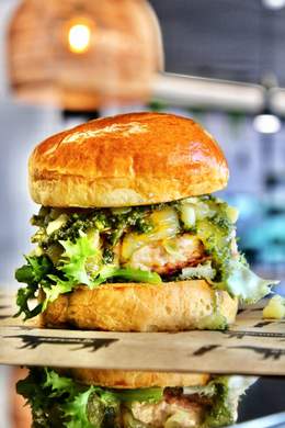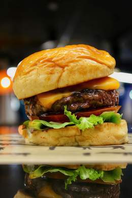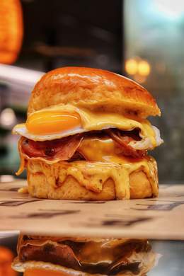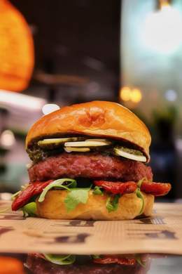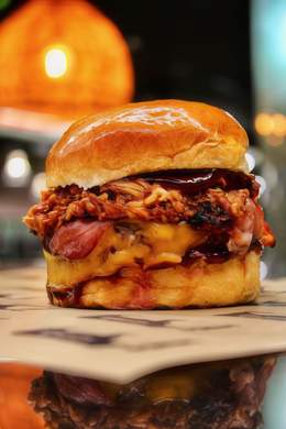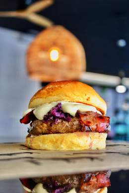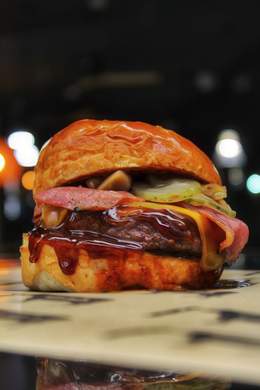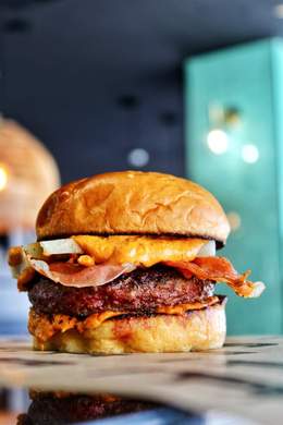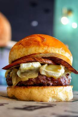 180GR. DE CARNE DE VACA AÑEJA A LA PARRILLA DE CARBÓN, CRUJIENTES AROS DE CEBOLLA, DOBLE DE BACON, CEBOLLA CRUNCHY Y SALSA BURGER
