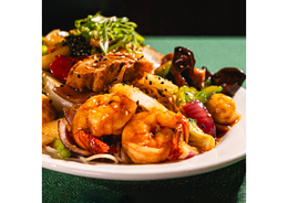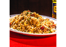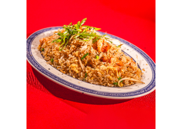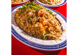 Arroz salteado al wok con contramuslo de pollo, langostinos, cerdo asado, huevo, cebolleta, semillas de sésamo y salsa de soja.