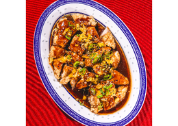Contramuslo de pollo crujiente, bañado en salsa agridulce de tamarindo, piña y durazno y sésamo.