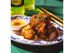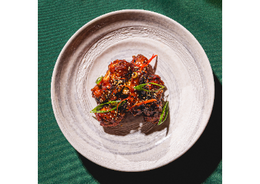 Contramuslo de pollo crujiente, bañado en salsa chijao, cebolleta y sésamo.