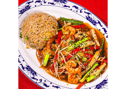 Arroz chaufa acompañado de tallarín saltado de langostinos.