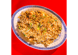 Arroz y pasta china, con contramuslo de pollo, langostino, cerdo asado, huevo, brotes de soja, semillas de sésamo y salsa de soja.