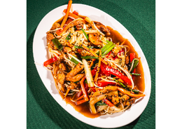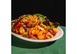 Pasta china salteada al wok estilo chifa con contramuslo de pollo, cerdo char siu, pato, hongos wan yi, langostinos, huevos de codorniz, brócoli, pimiento rojo, brotes de soja, col china y sésamo.