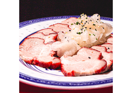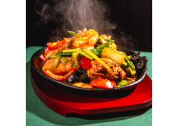 Pollo en trozos, cerdo char siu, langostinos y pato salteados al wok con salsa agridulce de tamarindo, pimiento rojo, col china, cebolla morada, tirabeques, huevos de codorniz, piña, durazno, acompañados de wantanes rellenos de pollo.