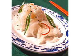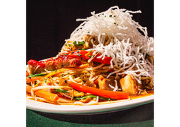 Pasta china salteada al wok estilo chifa con contramuslo de pollo, cerdo char siu, langostinos, brotes de soja, col china, pimiento, tirabeques, huevo de codorniz, cebolla blanca y fideo fan si crocante.