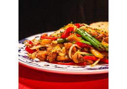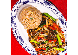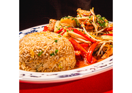 De cerdo char siu salteado con cebolla roja, pimiento rojo, tirabeques y ajo laminado, acompañado de arroz chaufa.