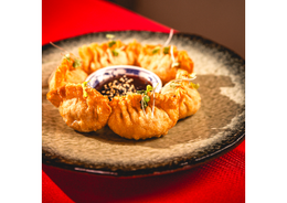 Contramuslo de pollo, cerdo char siu, pato, hongos wan yi, langostinos, huevos de codorniz, brócoli, pimiento rojo, col china y sésamo.