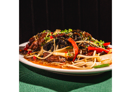 Ternera al wok salteado con verduras orientales en aromas de sesamo, salsa de soja y ostras acompañado de patatas crocantes y arroz blanco.