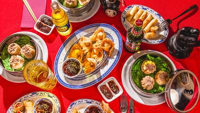 Caldo de pollo y jengibre, siu kao relleno de langostinos y pollo, col china, cebolleta, hongos wan yi & aceite de sésamo.