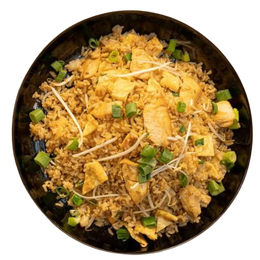 arroz salteado con trozos de pollo, huevo, cebolla china aromatizados con salsa de soja y aceite de sésamo.