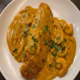 tacu tacu de frejol cubierto con mariscos en su propia salsa, espolvoreados con cilantro picado.