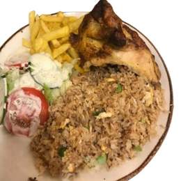1/4 de pollo a la brasa con patatas fritas , ensalada y arroz chaufa