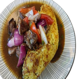 Tacu tacu de aji de gallina cubierto con tiras de lomo fino salteado con tomate ,cebolla, cilantro en salsa de soja y ostras.