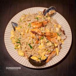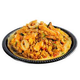 Arroz salteado con mistura de mariscos , huevo, cebolla china aromatizados con salsa de soja y aceite de sésamo.