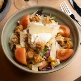 Pollastre arrebossat, formatge brie, tomàquet, brots d'enciam i maionesa de wasabi, inclou pa de briox i patates casolanes