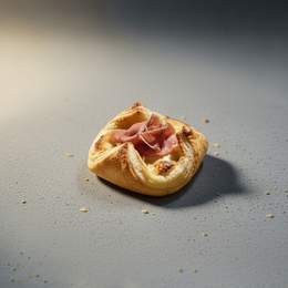 Mini pastel de hojaldre con queso de cabra encima y una loncha de jamón