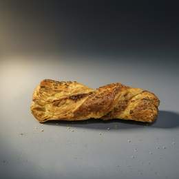 Trenza salada de hojaldre con olivas, tomate, queso y sesamo.