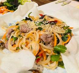 Fideos de arroz con ternera, limoncillo, lechuga, zanahoria, hierbas, pepino, cacahuetes, cebolla frita. Junto con salsa agridulce casera