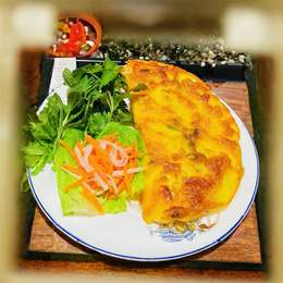 Un panqueque grande con brotes de soja y hierbas con langostino. Junto con salsa agridulce casera