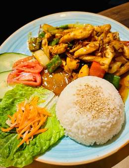 Arroz con Ternera salteada con limoncillo, chili, cebolla, verduras