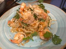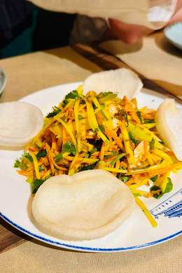 Mango verde, hierbas, cacahuetes, cebollas fritas, cilantro y langostinos. Junto con salsa agridulce casera