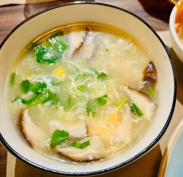 Rico caldo de hueso, setas, huevo, maíz, guisantes, cilantro, pollo