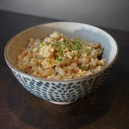 Salteado de arroz gohan con langostinos, presa ibérica y verduras