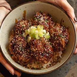 Muslitos marinados en jengibre y tempurizados con arroz y mayonesa tonkatsu acompañados con arroz gohan