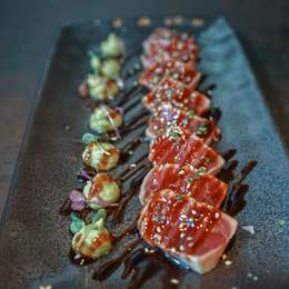 Tartar de atún, mayonesa picante, sésamo y lollo rosso