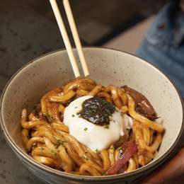 Fideos al wok con presa ibérica, setas y huevo con trufa