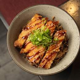 Fideos de trigo sarraceno con katsu de pollo, shiitake y cebolleta
