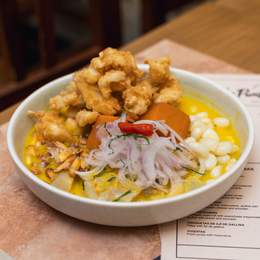 Corvina y chicharron de pota con leche de tigre de ají amarillo