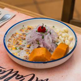 Corvina en leche de tigre tradicional, choclo, camote y cancha