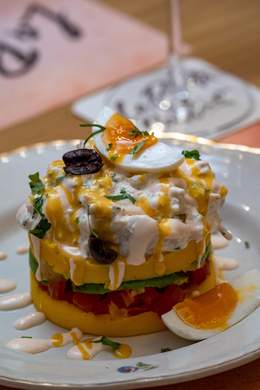 Patata prensada con ají amarillo, tomate, aguacate y pollo, servido con huancaína
