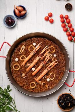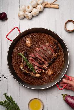 AROMAS MEDITERRÁNEOS La Gourmet que nace del fuego tradicional con la máxima calidad, cocinado a fuego lento y con alma. Paella de carne, marinera, negro, vegano y fideuá