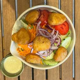 grande ensalada fresca con nuggets, lechuga, zanahoria, tomate, remolacha, cebolla roja y vinagreta. Coca Cola original (33cl) , postre del dia ( cheesecake y durazno)