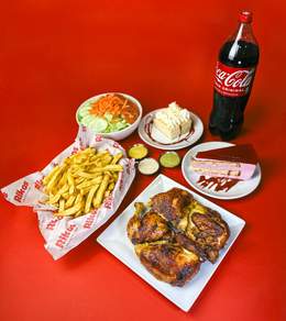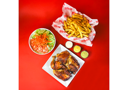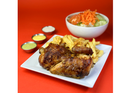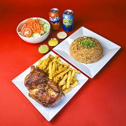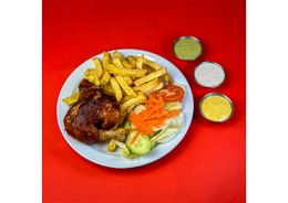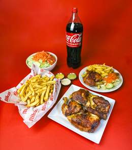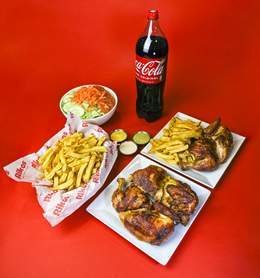 1/2 Pollo a la brasa + patatas fritas + ensalada clásica mediana + salsas.